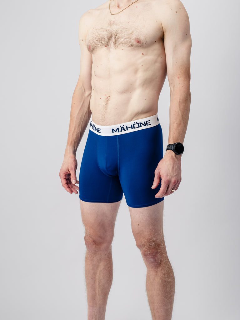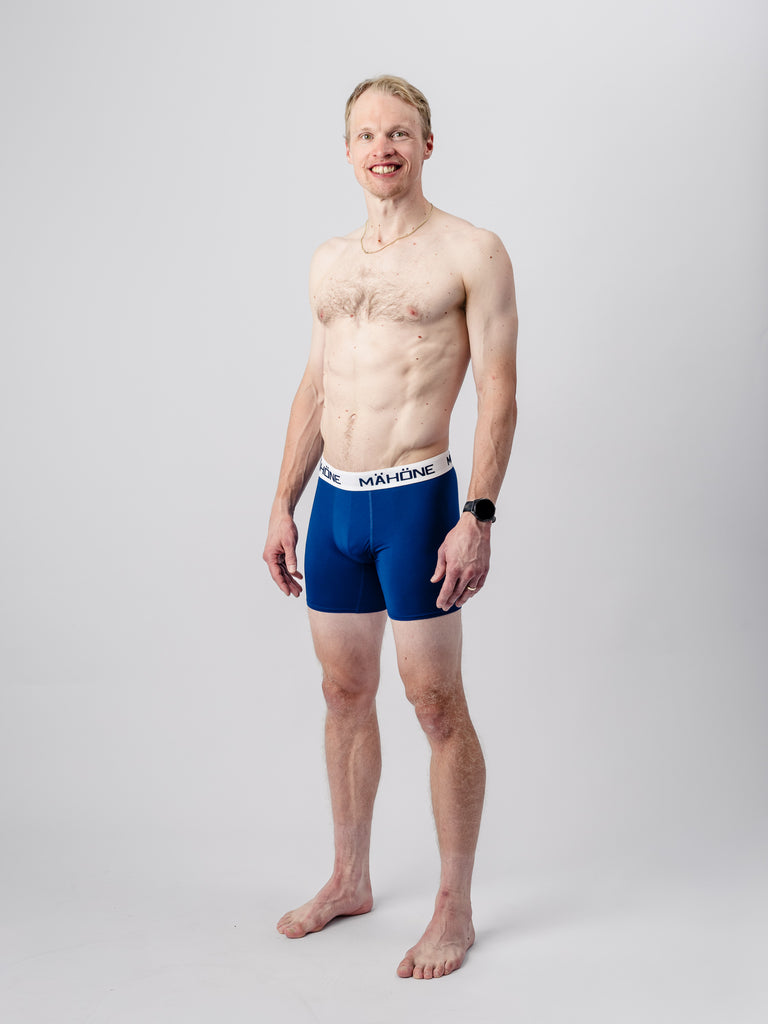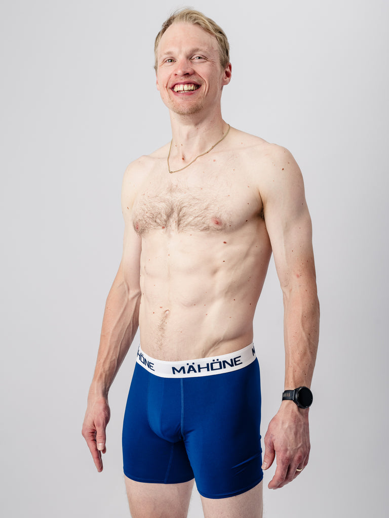 A blue-and-white technical base layer designed to prevent chafing and efficiently wick away moisture. We have chosen polyester as the base material, which in our view is the most effective at removing moisture and provides excellent breathability. We have added 10% elastane to the fabric to increase comfort and flexibility. The cut of the underwear is designed so that the number of seams is minimized and moved away from critical areas. The waistband is the guaranteed and familiar Mähöne quality.